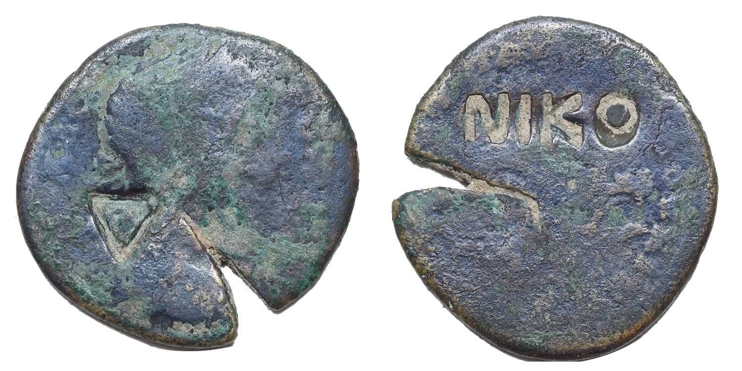 Előlap/obverse: mellkép jobbra, nyak mögött háromszög beütésű ellenjegy