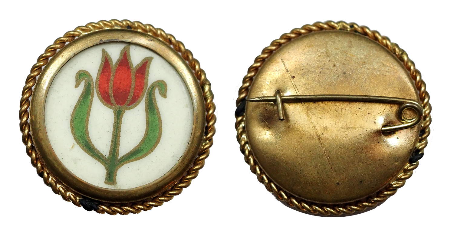 zománcozott jelvény, 1910 körül. Az Országos Tulipánkert Szövetség (majd Tulipánszövetség Magyar Védőegyesület) 1906 áprilisában alakult a magyar mágnásnők által még március 15-én kezdeményezett mozgalomból. Magában foglalta a magyar élet vezetőit, ipari vásárokat, estélyeket, zsúrokat rendezett, hogy ébren tartsa, élesztgesse a lelkesedést a magyar ipar termékei iránt.