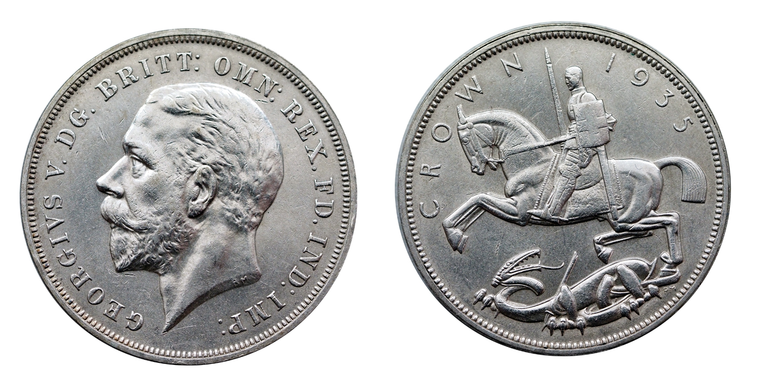Ag Crown 1935-ből, uralkodásának 25. évfordulójára. Ez az egyetlen típus, amelyen szakítanak a hagyományos Szent György ábrázolással, markánsan eltérő új rajzolattal.