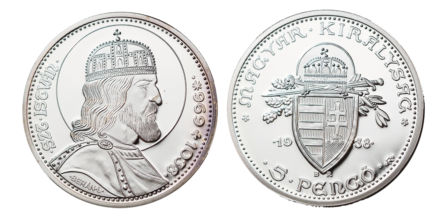 Ezüstözött bronz 5 pengő 1938, utánveret