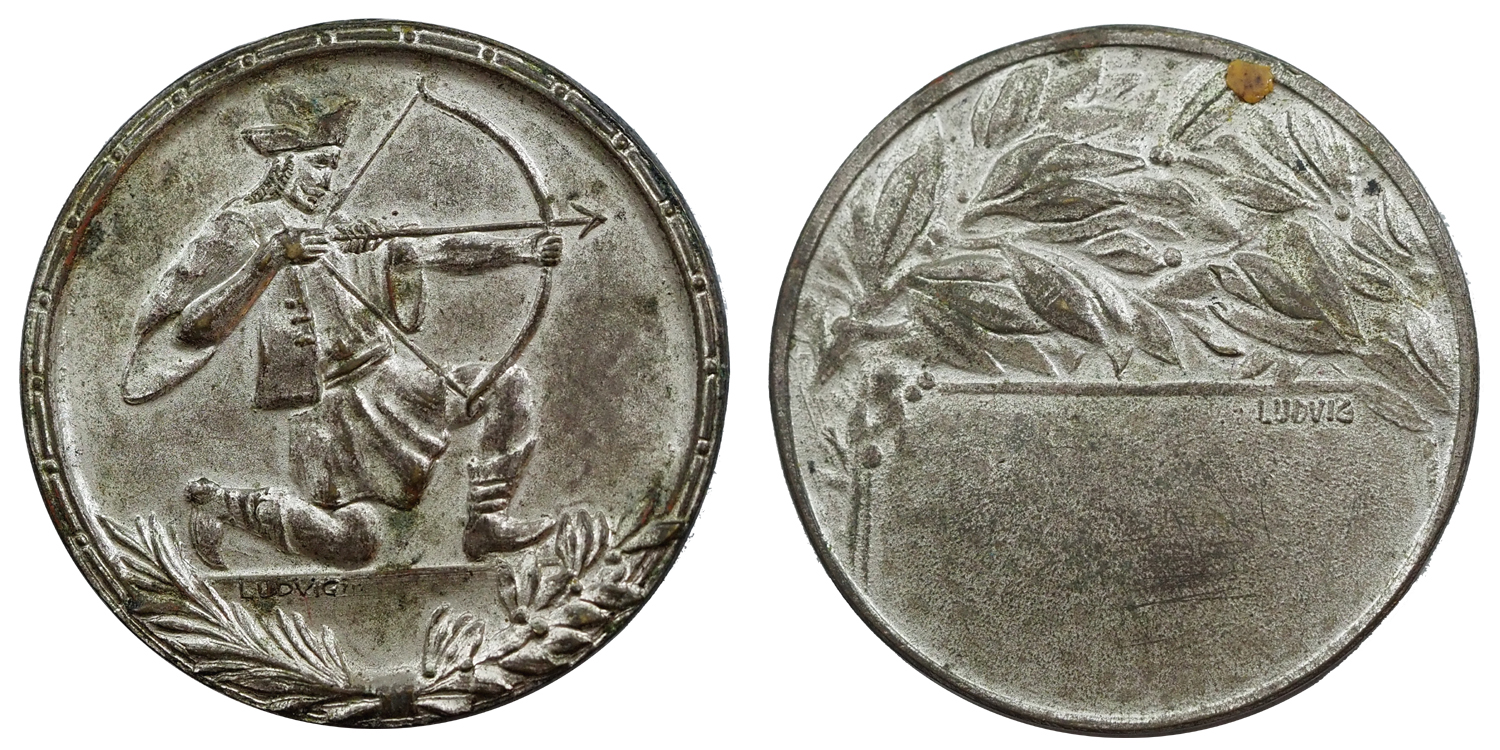 ezüstözött bronz érem, térdelő férfi íjjal, a két világháború közötti időszakból