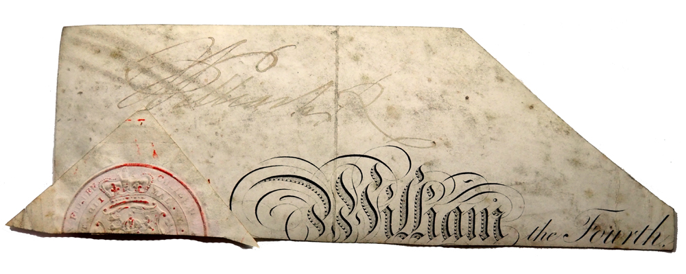 százarpecsétes dokumentum felső része, rajta IV.Vilmos aláírásával