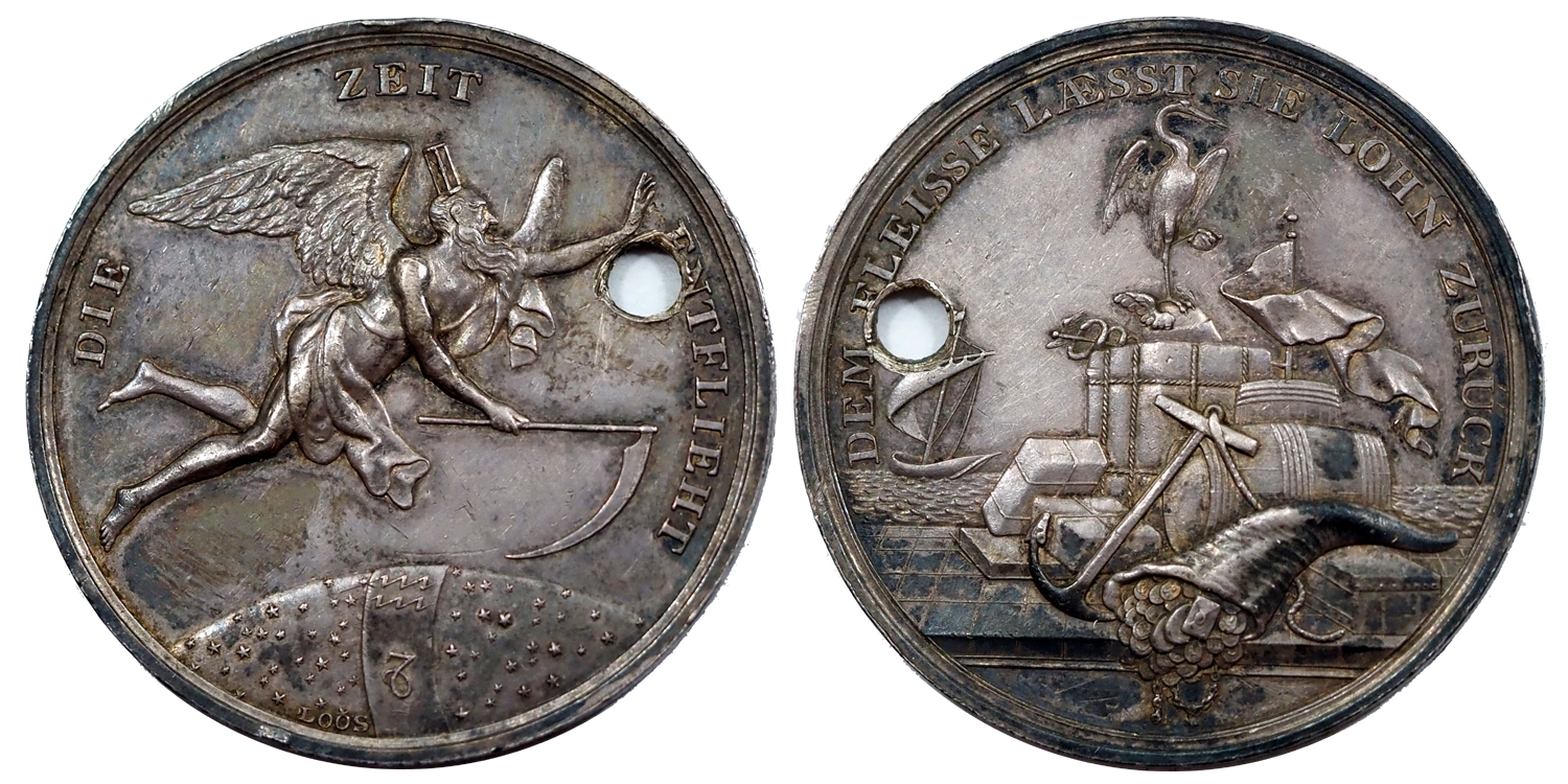 Hátlap/reverse: különböző szimbólumok: bőségszaru, Merkúr-bot, horgony, hátul vitorlás hajó