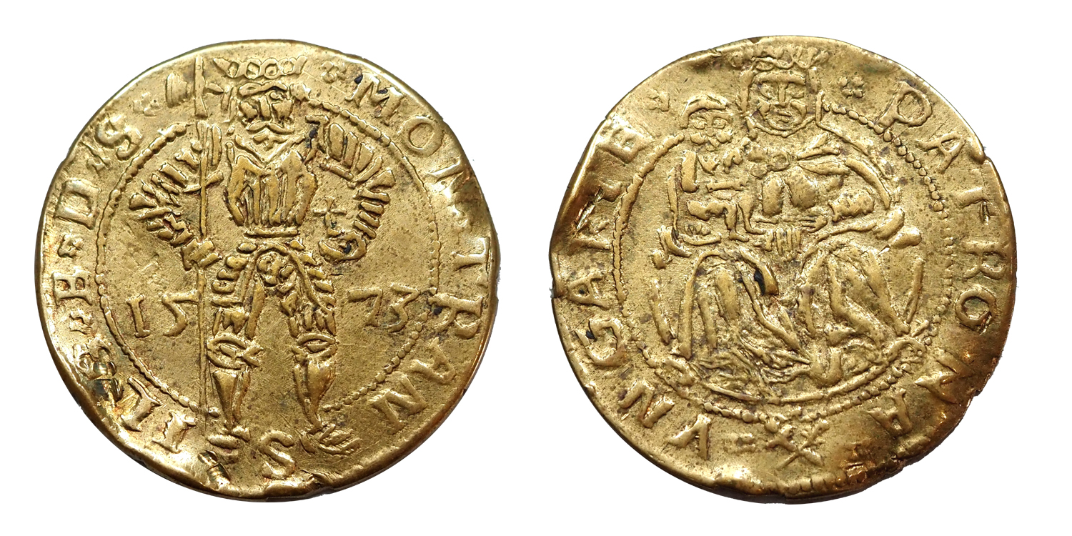 Au aranyforint 1573 Szeben. Korabeli igen ritka hamisítvány! Csökkentett súlyú, alacsonyabb /ca.600-as/ aranytartalommal. Jól láthatóan korabeli forgalomban volt a darab.