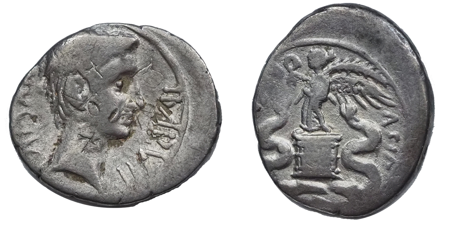 Hátlap/reverse: szárnyas Viktória középen áll, kátoldalt egy-egy kígyó