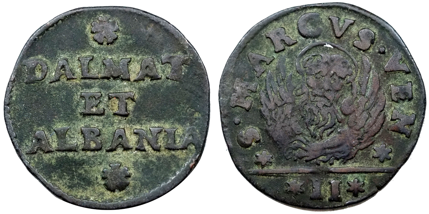 Cu 2 Soldi 1684-1691 között, Dalmácia és Albánia forgalmára.